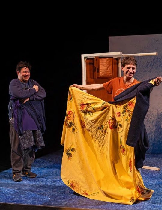 Le spectacle, dominé par la couleur bleue, montre les deux frères adultes évoquant leur enfance à travers des souvenirs parfois flous. Selon Catherine Verlaguet, l’autrice, la lumière peut pénétrer les failles. La justesse et l’humanité de ses mots sont portées sur scène par Bénédicte Guichardon, qui privilégie proximité et légèreté.